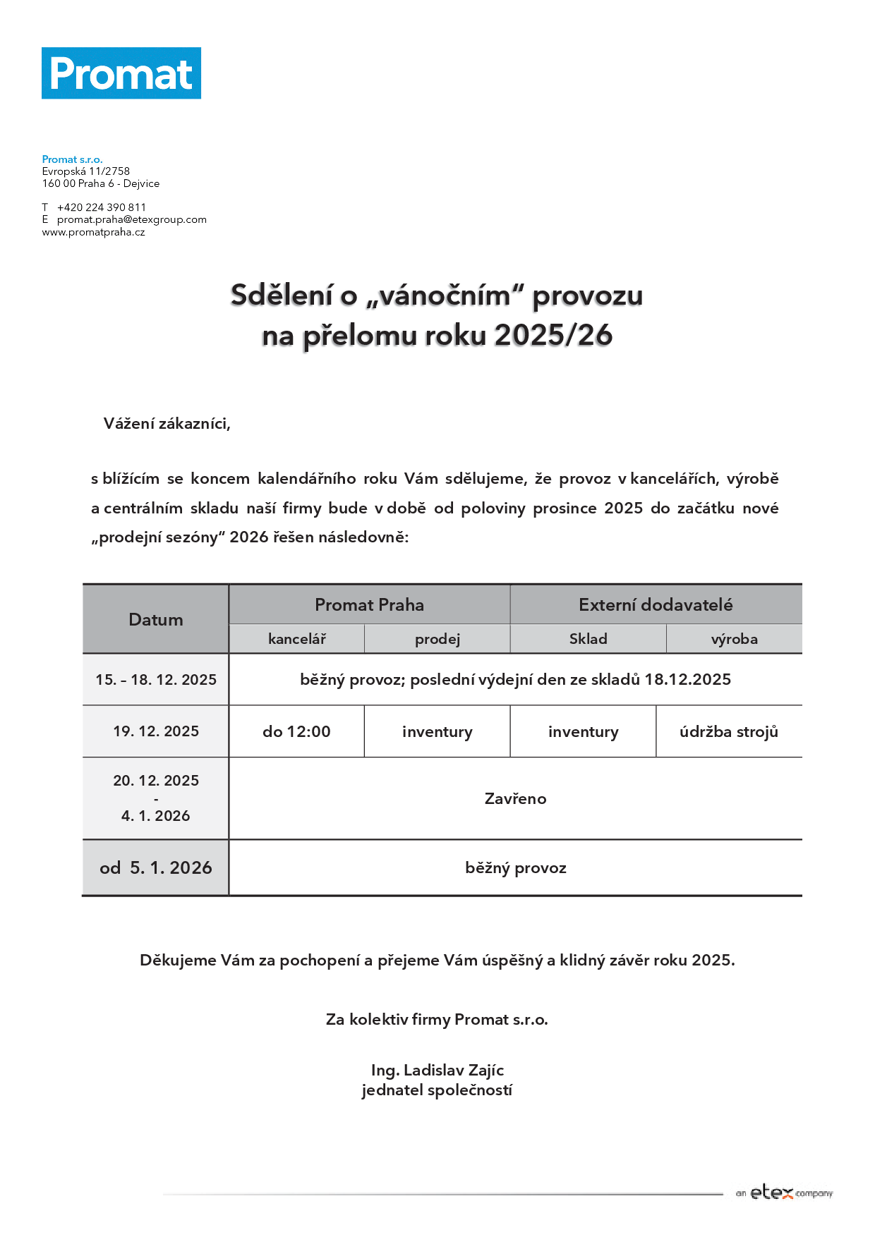 s blížícím se koncem kalendářního roku Vám sdělujeme, že provoz v kancelářích, výrobě a centrálním skladu naší firmy bude v době od poloviny prosince 2025 do začátku nové „prodejní sezóny“ 2026 řešen následovně: